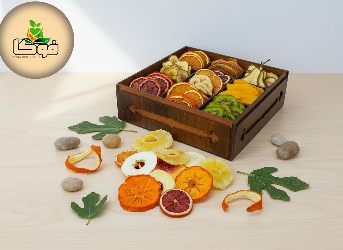 شامل: سیب خشک، کیوی، پرتقال خشک و توتفرنگی خشک.